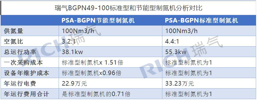 下面以瑞氣所生產(chǎn)的純度為99.99%的節(jié)能型制氮機為例,和標準型制氮機的參數(shù)進行對比及分析。